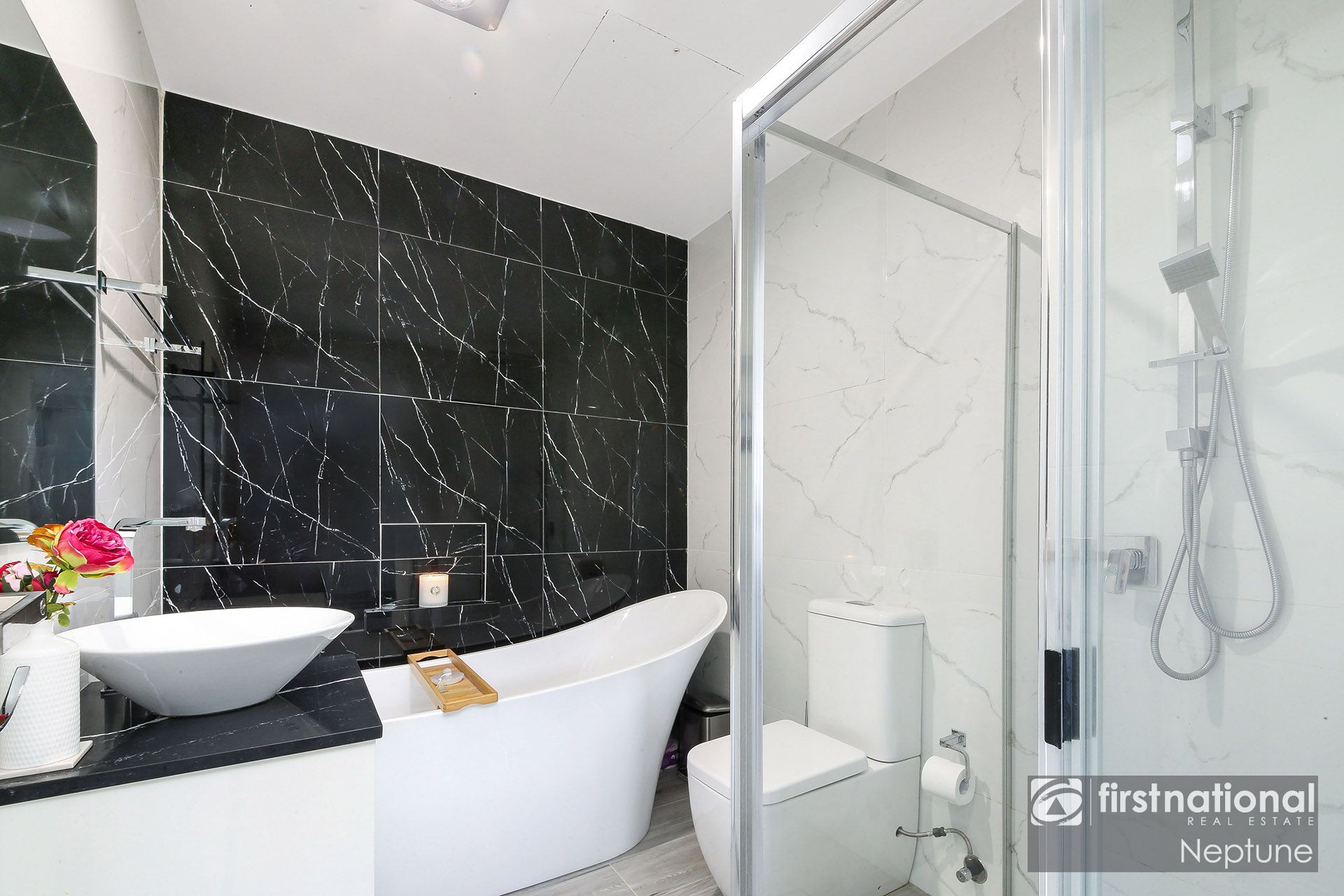 The modern kitchen is equipped with premium Miele appliances, 40mm stone benchtops, and ample storage. Upstairs comprises a generous master with ensuite and balcony, plus three bedrooms with built-ins, serviced by a stylish main bathroom. A full bathroom downstairs adds convenience.